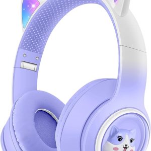 Wireless on ear headphones with microphone for children cat ears led rgb purple